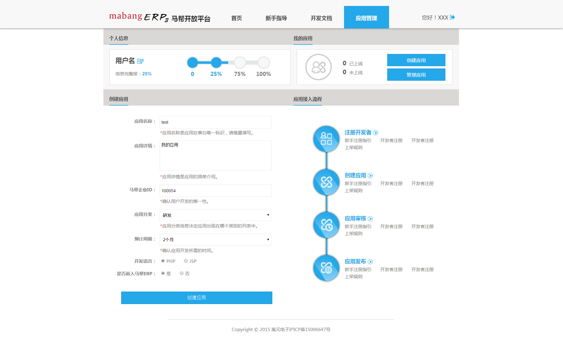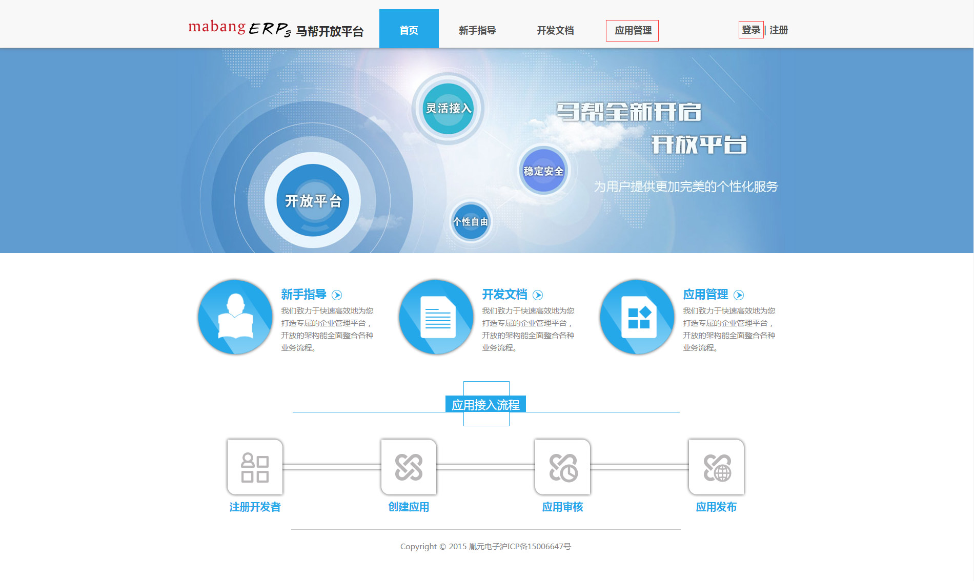 1.打开马帮开发平台,如下图2.点击应用管理或者登入,输入已注册过并已通过审核的账号和密码,点击确认进入应用管理的界面3.在应用管理界面,点击创建应用按钮4.填写应用的基本信息,其中应用名称、应用详情、马帮企业ID、应用分类、预计周期为必填项,按照规范填妥信息后。5、点击“确定”即可成功创建应用,并且还可以对该应用查看与删除的操作